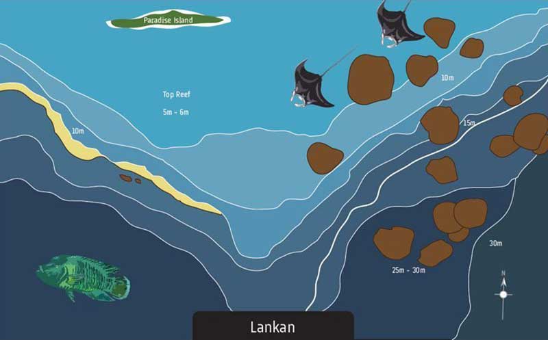 Манта Пойнт (Lankan Manta Point) - этот сайт расположен рядом с отелем Paradise Island resort и является одним из самых известных сайтов, куда приплывают на чистку манты - гигантские, пелагические скаты. Здесь, с помощью рыб и креветок-чистильщиков, они избавляются от всевозможных паразитов, которыми обрастают за долгие месяцы скитаний. Манты приплывают как поодиночке, так и группами до десяти особей. На глубине около 18 метров, около пологой стенки рифа расположено большое плато, над которым мантам удобно маневрировать.