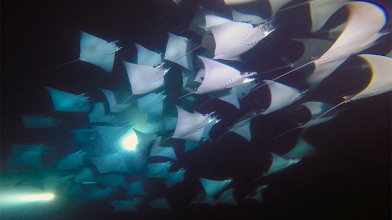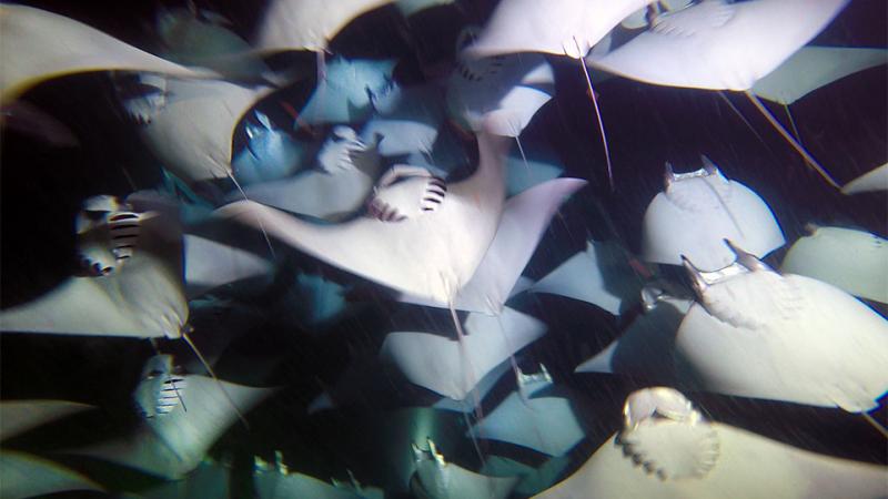 Не менее грандиозное зрелище - ночной дайвинг с мобулами. Дайверские фонари и дополнительное освещение привлекают массы планктона. Многочисленные стаи мобул на высоких скоростях бороздят придонное пространство, радуясь этому планктонному пиру. Они, словно стаи огромных летучих мышей или эскадрильи грозных Юнкерсов, внезапно налетают из темноты, чтобы уже через мгновения вновь исчезнуть в ночной мгле. Их косяки довольно плотные и буквально поглощают все вокруг, весьма ощутимо ударяя крыльями завороженных дайверов.